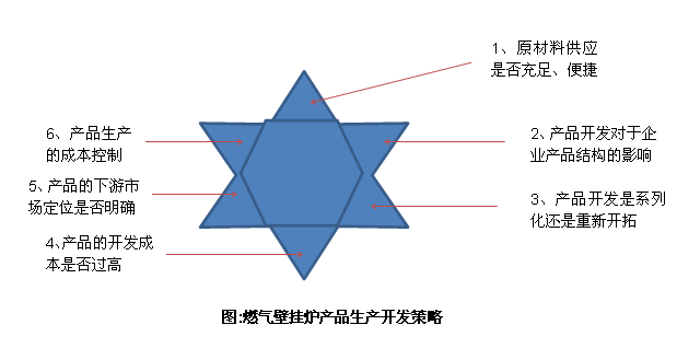 在產品生產和開發中,企業應考慮的問題很多。我們建議壁掛爐企業從戰略角度出發,先確定主營產品和主營業務,再針對性的配置產品和開發新產品。尤其是開發新產品,壁掛爐企業一定要對其合理定位,不能追求短期的效益而影響企業主營業務的地位。面對目前國內還不成熟的壁掛爐市場,企業只有先做專、做強,最后才能做大。雖然多元經營的誘惑很大,但是企業應避免產品多而不強的現象發生。下圖為壁掛爐企業在產品開發時,提供了六個方面的思考和測評,將會大大提高產品開發的成功率。
