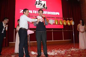 一輪熱舞過后,當然是簡單而又隆重的頒獎禮。首先是頒出“2014年度優秀經銷商”,由馬瑞董事長頒發給新疆省庫爾勒經銷商劉海波先生,感謝他為瑞馬壁掛爐終端市場所作的杰出貢獻!接著就是“2014年度最優秀員工獎”,頒發給我們最可愛的馮興石員工。其實我們私下都喜歡稱他為“馮導”,特別地逗趣!也必須感謝他長年累月地出差在外,為我們維護經銷商,配合經銷商客戶的銷售工作!看到頒獎獎品居然還有iphone6,我的眼睛都發亮了!瑞馬公司真的太任性,太土豪了!